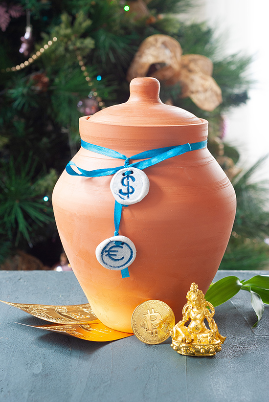 Citrine crystals have a vibrant but clear color, representing purity. They hold no negative energy. A wealth vase or jar filled with valuable objects represents cherished treasures and prosperity. A money frog with coins in its mouth invites prosperity and abundance while representing longevity and wisdom. Chinese-shaped coins strung together are considered lucky charms, representing vitality and protection and are said to attract more money. All these elements encourage good health, create optimism, confidence, and opportunities for the family.