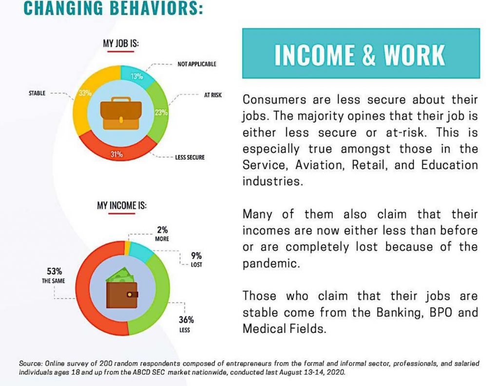 However, as the quarantine lengthened, there was growing impatience and unrest with the situation that does not seem to have a solution in the near term. There was heightened uncertainty for the future as actual income has also contracted. In an online survey conducted by OMG Advertising among 200 Filipino respondents belonging to socioeconomic classes ABC and D, 31 percent already felt that their job is less secure and 23 percent said their jobs are at risk. Furthermore, 36 percent are earning less while nine percent have lost their income.