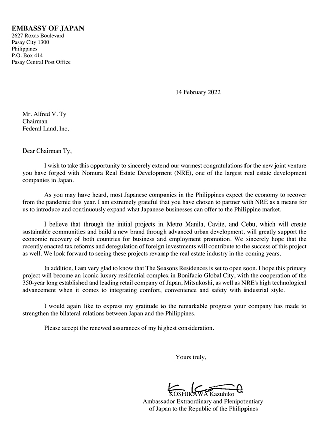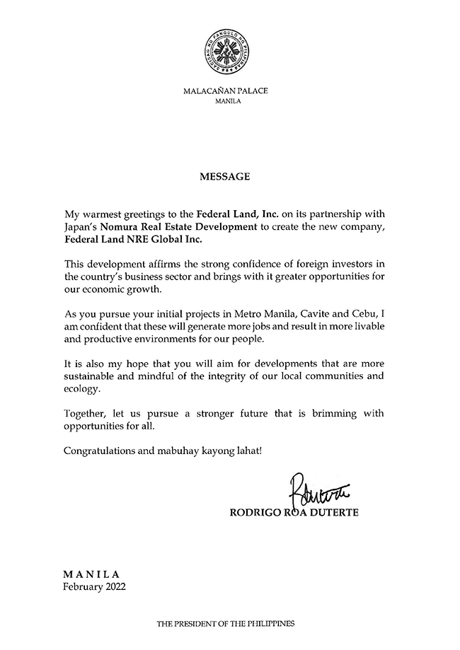 “My warmest greetings to Federal Land Inc. on its partnership with Japan’s Nomura Real Estate Development to create the new company, Federal Land NRE Global Inc.