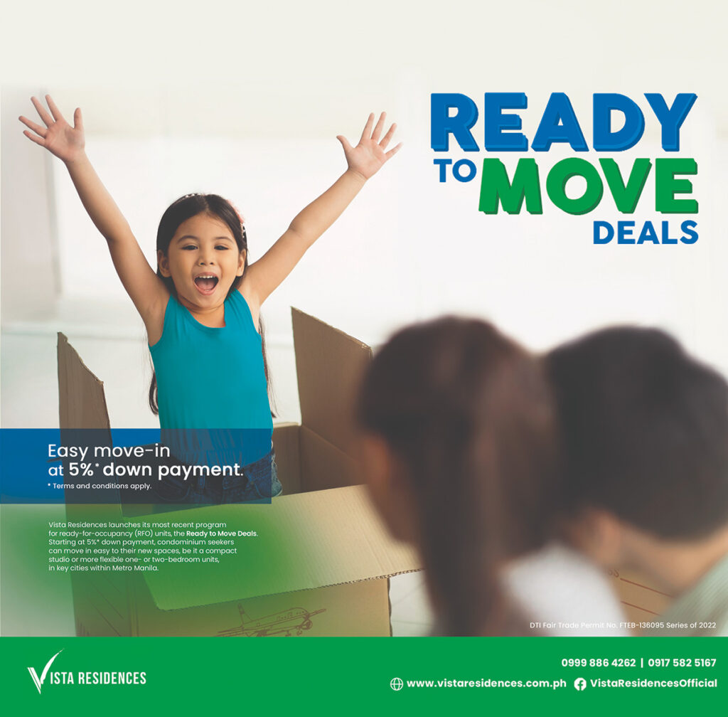 Informed by the optimistic real estate outlook for the year, Vista Residences, the condominium arm of the Philippines’ largest homebuilder, Vista Land, is offering Ready to Move Deals to those aspiring to have their own space in the metro. The program, exclusive for its ready-for-occupancy (RFO) units, enables home seekers to purchase starting at 5 percent down payment, save on discounts, and move in easily to their new condominium property.