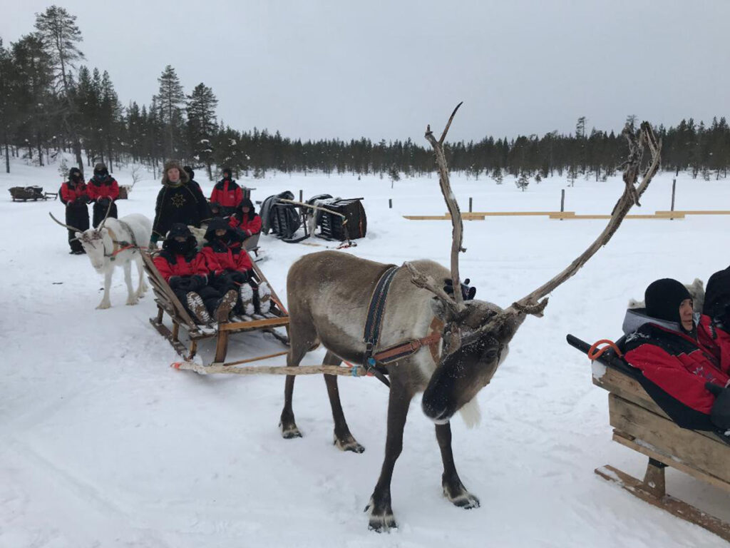 Temporarily taking a break from that adrenaline rush, we walked a short distance to experience an opposite, slow and tranquil ride with the reindeers without Santa Claus. Reindeers are famous inhabitants of the area, and a reindeer-pulled sleigh is considered a traditional way to move around.