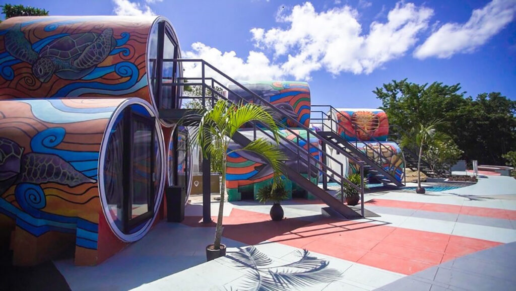 Millennial Resorts offers premium hospitality amenities. It manages the unconventional accommodations of the surreal capsule-like rooms of the Cocoons with exteriors painted with murals depicting marine life and Crusoe Cabins which are repurposed container vans that are rustic-looking huts on the outside but are contemporary rooms with modern amenities, with options for beachfront and garden view.