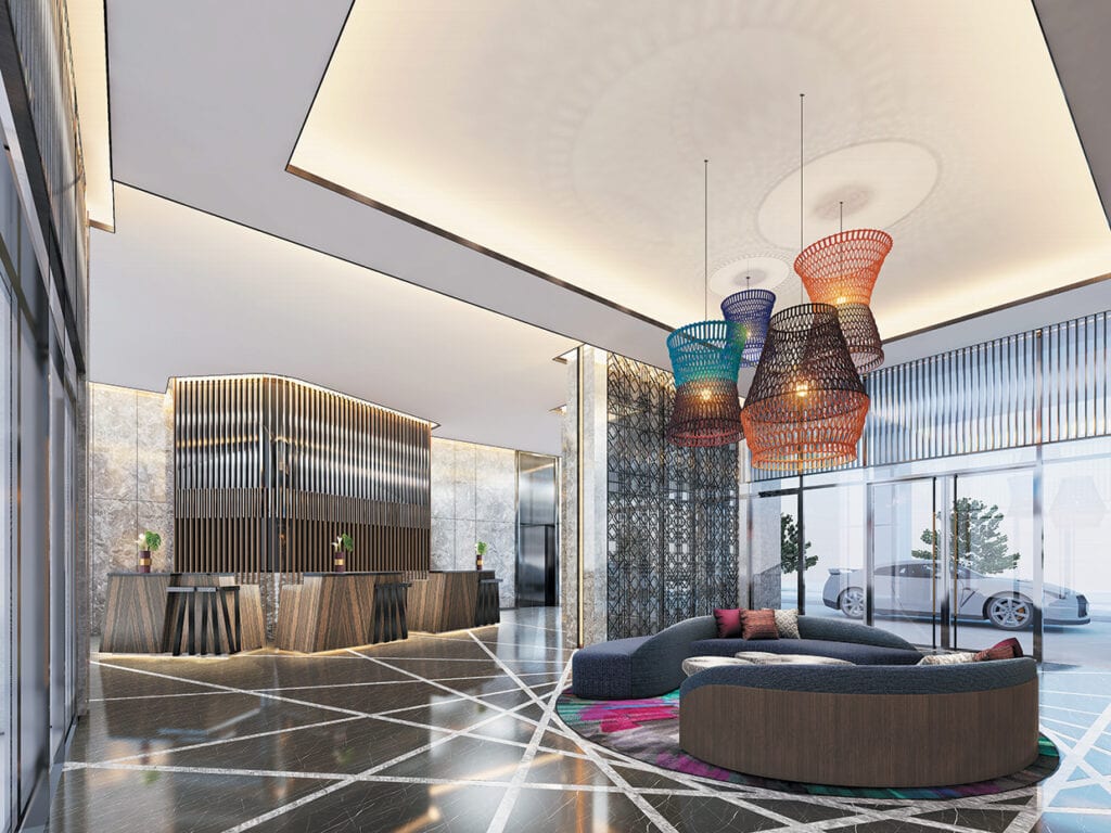 “As an example, the lobby planning itself has a more welcoming arrival with a central lounge for waiting guests who are either directed toward the reception and guest lifts on one side, or the formal lounge and co-working space on the other side. This layout represents how Cebu is the convergence of Philippine trade and business from both the north and south. The layers of design elements then envelop the space with patterns inspired by local arts and crafts. Suspended vertical screens surround the lobby to define the transition from the urban outdoors. This linear pattern was replicated behind the reception counters. The overall backdrop has a neutral material palette accentuated by the colors of the furniture fabrics, area rug and woven pendant lamps,” he says.