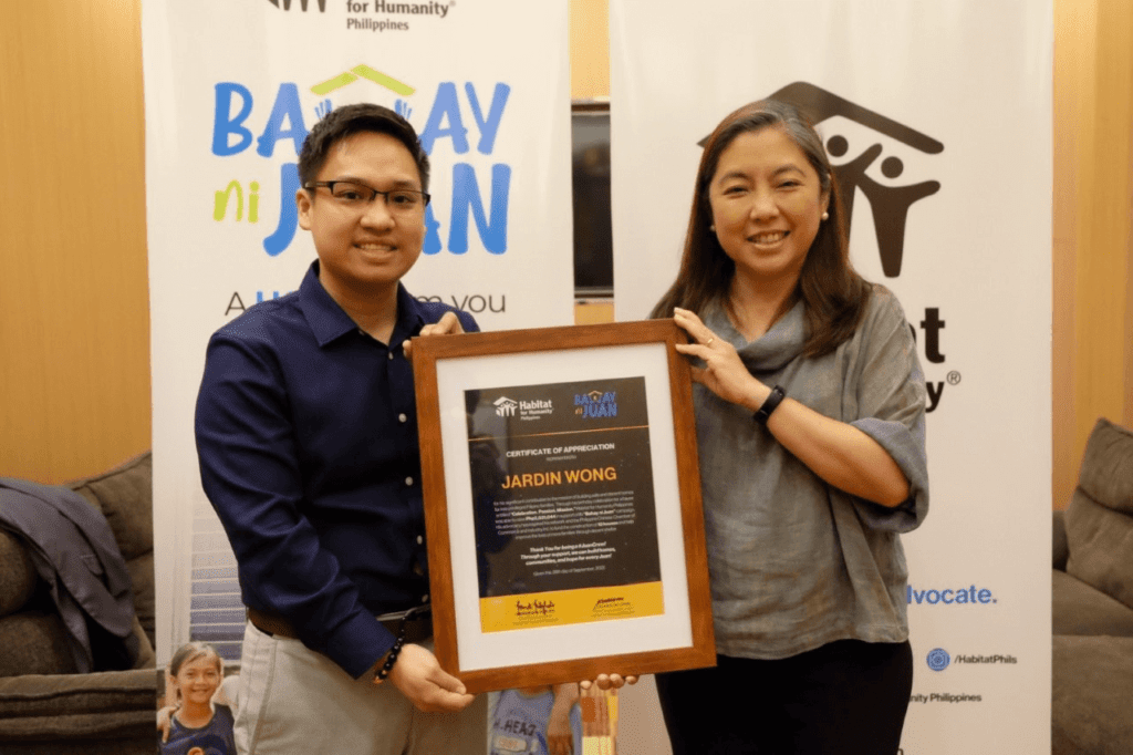 Turning his passion into a purpose-filled mission, young housing advocate and Mosaic Realty and Development Corp. CEO Jardin Wong handed over a check worth P2 million to Habitat for Humanity Philippines CEO Mardi Mapa-Suplido, in support of the organization’s Bahay ni Juan individual giving campaign.