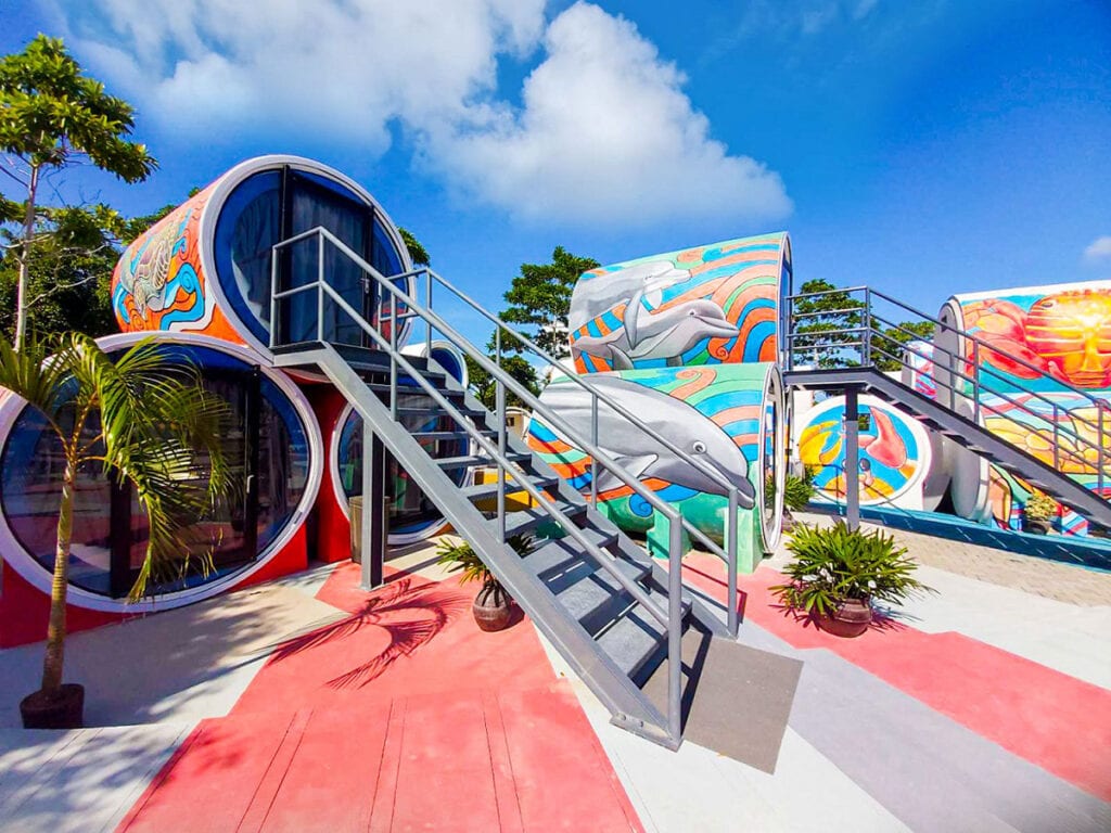 Club Laiya is a favorite among tourists for its 33 Cocoons, the cylindrical sleeping pods, each outfitted with a queen-size bed, air-conditioning, TV, and fridge, The Cocoons are a few steps away from the modern communal bathrooms balanced with its private spaces.