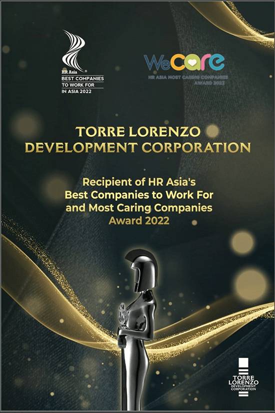 Torre Lorenzo was also recognized as one of HR Asia’s Best Companies to Work For in 2022. The Company was also a recipient of HR Asia’s Most Caring Companies Award 2022. Out of 185 Filipino companies that took part in HR Asia’s proprietary Total Engagement Assessment, only the top 35 companies were named as HR Asia’s Best Companies to work for in Asia 2022. From this roster, only six companies were given the Most Caring Companies Award 2022.