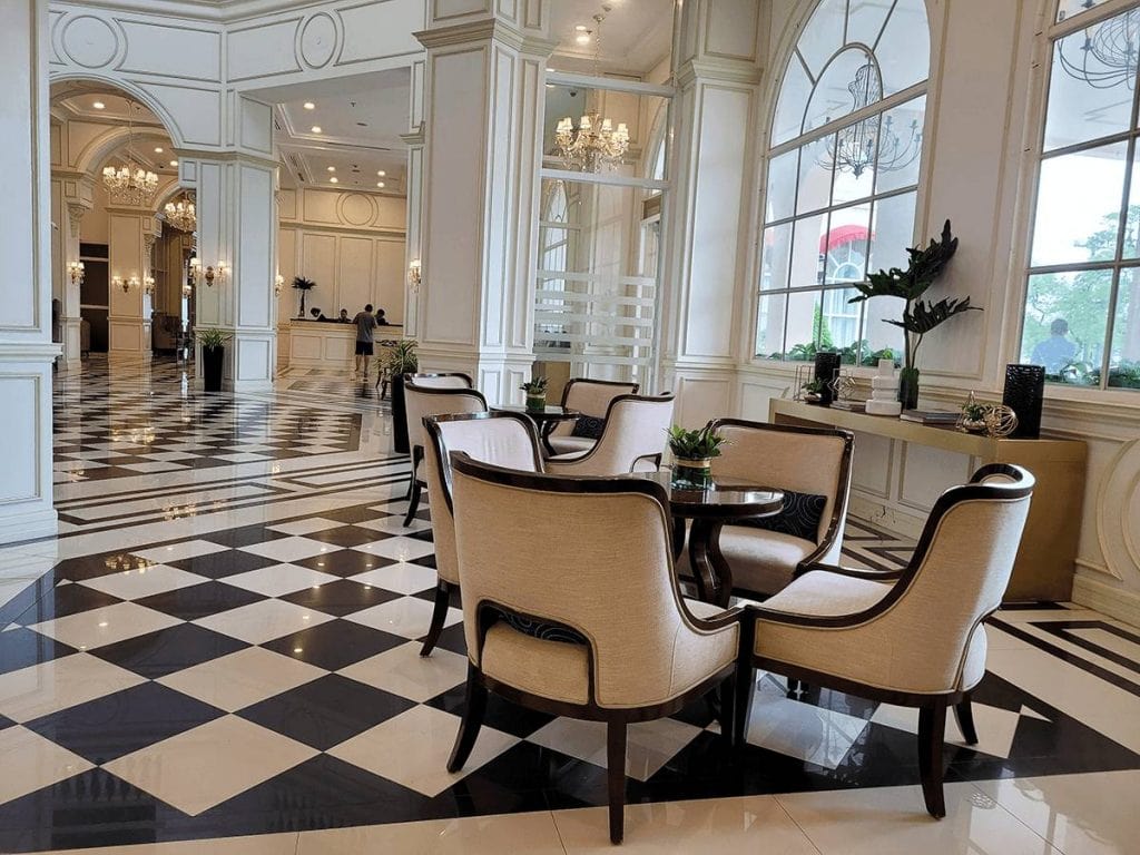 Rizal Park Hotel manages to feel both old and new. The impressive airy lobby boasts of classic black and white checkerboard tiles complemented by pops of color in the carpet going up the stairway and stained glass windows surrounding the dramatic domed ceiling.