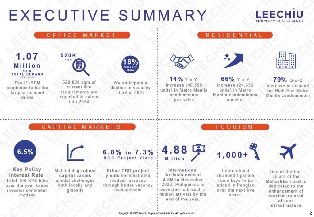 Full year 2023 aggregate office demand for the country increased by eight percent from 2022, recording 1.07 million square meters of newly leased space. This brought down overall vacancy to 18 percent from 19 percent.
