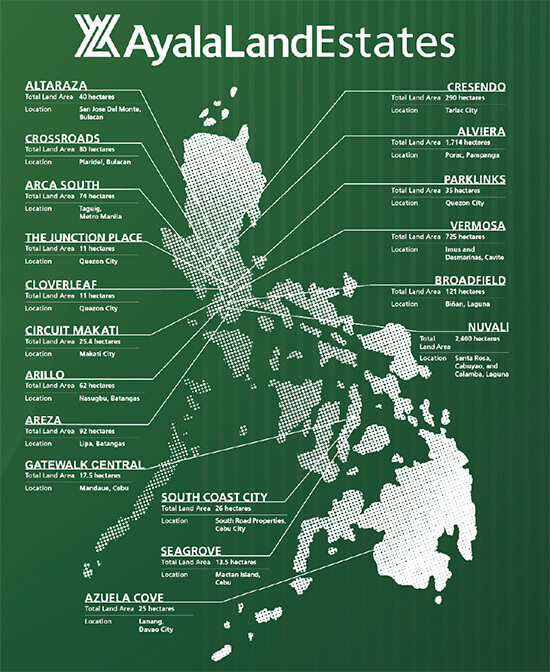 At Ayala Land Estates, it is never just about brick and mortar; it is about creating environments where life in all its dimensions can flourish. Each estate tells a unique story that shares a common heart—a commitment to transform lives for the better. With 53 estates spread across the country and a landbank of over 13,000 hectares, Ayala Land is building for today and for the future, ensuring that each development becomes a vibrant chapter in the broader narrative of progress and transformation.