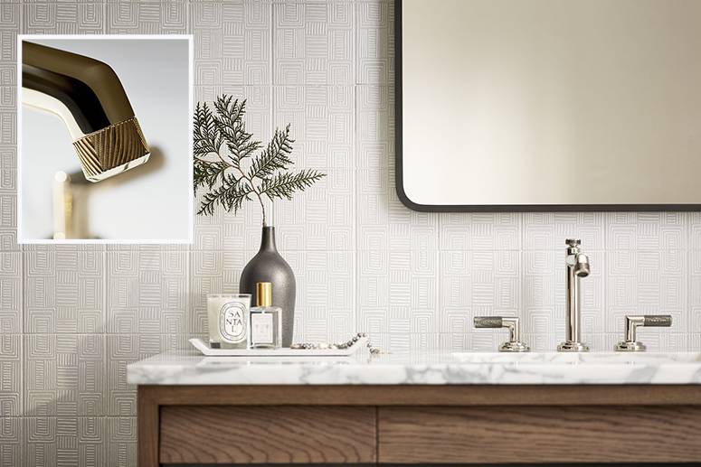 Kirar’s Pinna Paletta collection for Kallista highlights textural etchings in luxurious finishes for each of its bathroom fixtures.
