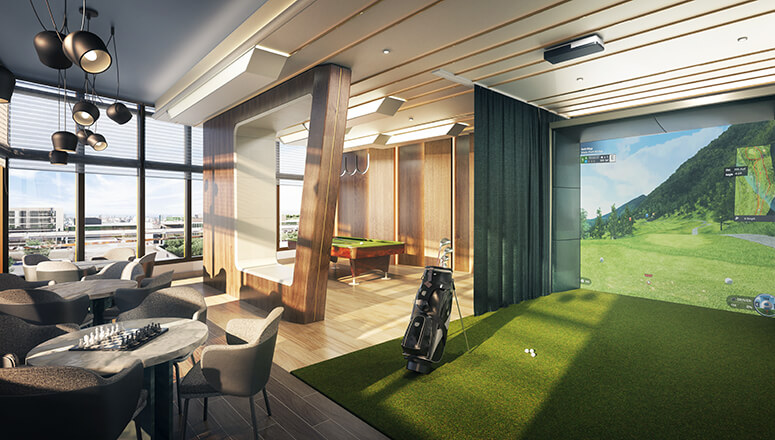 The golf simulator is part of a curated suite of amenities designed to enhance the lifestyle of its residents. Along with a pool, fitness center, and exclusive lounge areas, the game room exemplifies modern sophistication and convenience. The simulator offers an immersive experience, letting residents practice on renowned virtual courses, perfect their techniques, and even engage in friendly competitions with neighbors.