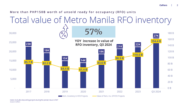 Colliers believes that the substantial amount of unsold RFO units is constricting developers to launch new condominium projects in the capital region. As of Q3 2024, Colliers data showed that unsold inventory in Metro Manila (covering pre-selling and ready for occupancy or RFO) reached 75,300 units. It will take about 5.8 years to fully sell out all these unsold condominium units, about five times longer compared to the pre-pandemic period (2017 to 2019) where remaining inventory life (RIL) ranged between 0.9 and 1.1 years. Of the 75,300 remaining inventory, 27,200 are ready-for-occupancy (RFO) valued at PHP154.4 billion (USD2.8 billion).