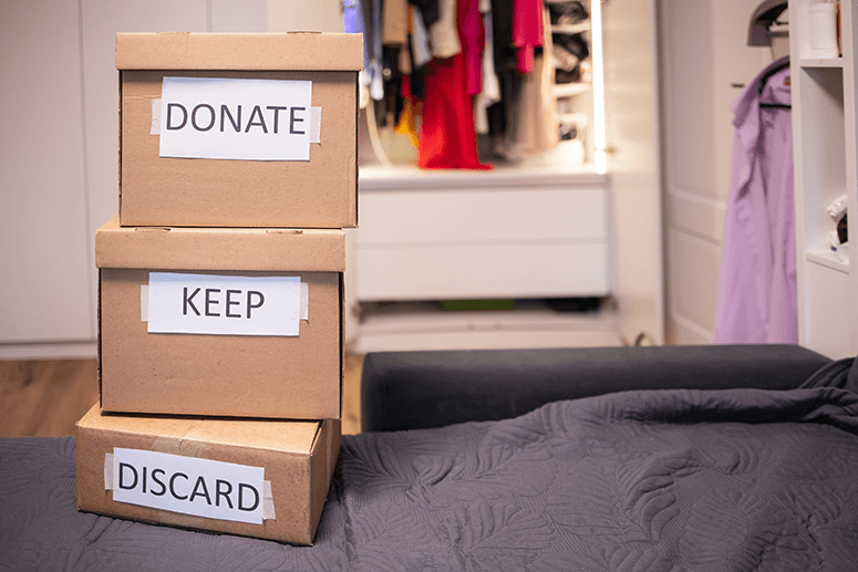 Seasonal purges. Every few months, commit to sorting through storage areas, like closets and cabinets to make sure you’re only keeping what you need.