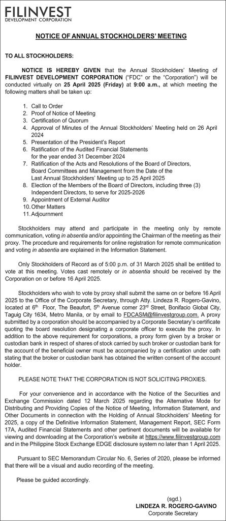 News and Events Filinvest gives notice of annual stockholders’ meeting BY Property Report PH TEAM March 31, 2025 0 393 #BrandedUp Tagsannual stockholders' meetingFilinvest Development Corporationproperty report Related Articles Spend a meaningful Holy Week at Discovery Samal Hospitality Kaway’an EcoPark lands on TIME’s World’s Greatest Places list News and Events Magis X introduces robotics-driven construction in the Philippines Industrial Celebrate Araw ng Davao with an island escape at... Hospitality Most Popular Women of influence: Shaping the future of leisure living News and Events All eyes on Alabang as economic momentum shifts to... News and Events Kaway’an EcoPark lands on TIME’s World’s Greatest Places list News and Events Pag-IBIG Loyalty Card Plus tops ₱1 billion in member... News and Events Latest Spend a meaningful Holy Week at Discovery Samal Kaway’an EcoPark lands on TIME’s World’s Greatest Places list Magis X introduces robotics-driven construction in the Philippines Celebrate Araw ng Davao with an island escape at Discovery Samal P.A. Properties earns Top Developer honors, expands bank partnerships