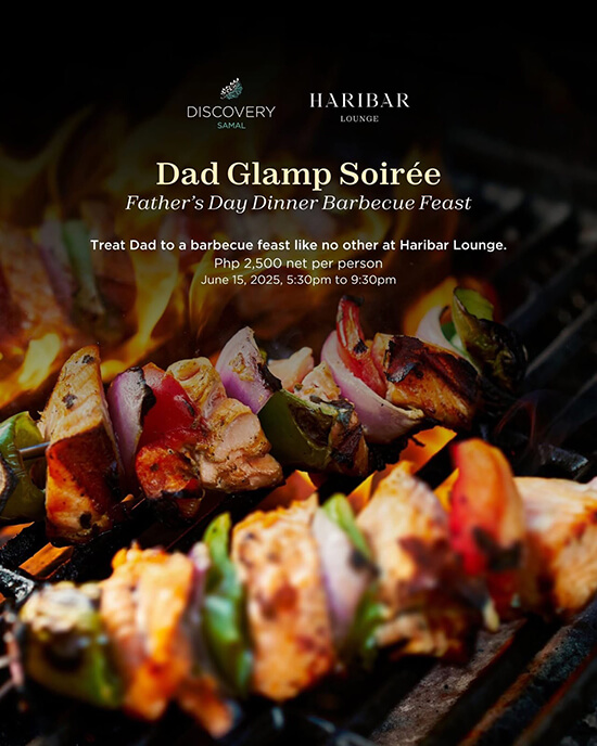 The evening before, on June 14, Haribar Lounge sets the tone with the Dad Glamp Soirée—a seaside barbecue experience that blends rustic charm with vibrant flavors. From 5:30 p.m. to 9:30 p.m., enjoy smoky grilled skewers, robust marinades, and chilled drinks in an open-air setting designed for relaxed bonding and laid-back fun. This flavorful gathering is priced at Php 2,500 net per person.