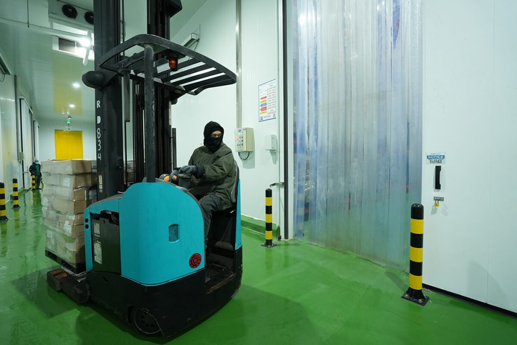 Inside the Artico Cold Chain facility. A forklift operator working efficiently in a temperature-controlled environment.