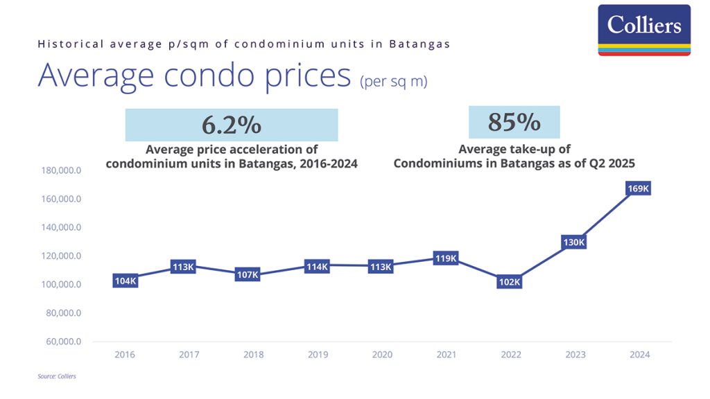 Meanwhile, take-up for lot-only units in Batangas is driven by the upscale to luxury segments (PHP2.7 million and above), particularly for projects in Calatagan and Lipa City. Average take-up of lot-only units in Batangas is 89 percent, priced at an average of PHP20,600 per sq meter as of Q2 2025. The high-end segment, starting at PHP30,000 to PHP50,000 per sq meter, recorded an average take-up of 77 percent as of Q2 2025.