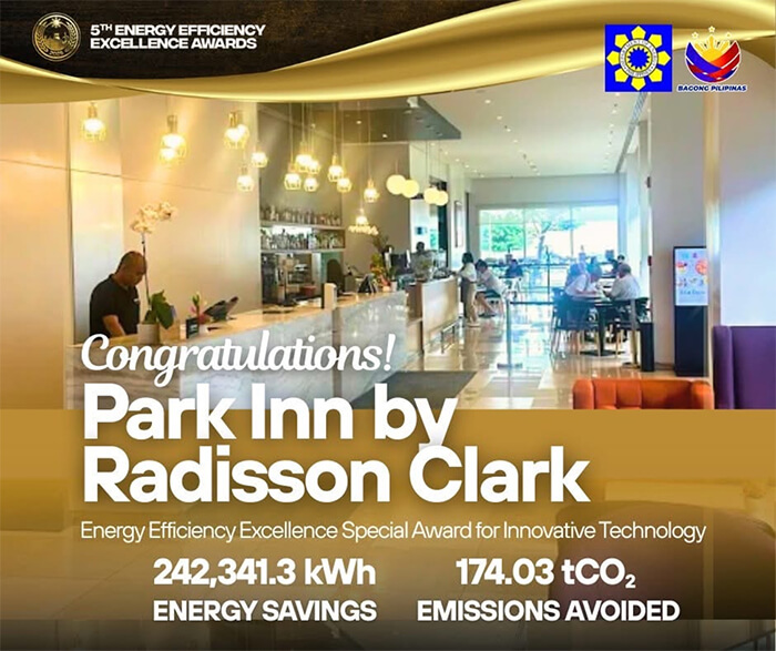 Park Inn by Radisson Clark, SM Hotels & Conventions Corporation’s (SMHCC) renowned property in Central Luzon, has been conferred a Special Award for Innovative Use of Technology at the 5th Energy Efficiency Excellence Awards organized by the Department of Energy (DOE). This distinction underscores the hotel’s exemplary Energy Efficiency and Conservation (EE&C) initiatives and its successful adoption of advanced systems that deliver measurable energy savings and environmental benefits.