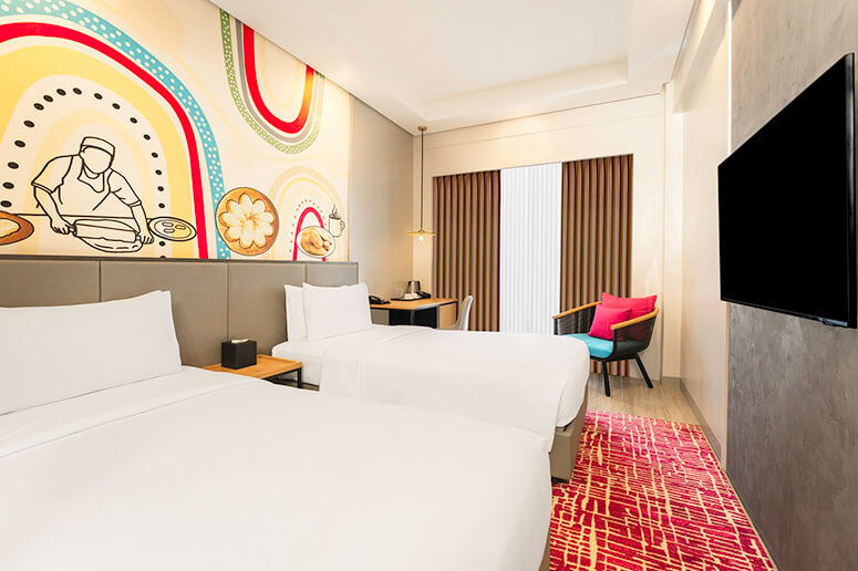 Inside the hotel, design becomes part of the storytelling. Coastal textures, wave-inspired forms, and coral motifs shape the interiors, anchored by a striking metal installation honoring Datu Lapu-Lapu—a nod to heritage and local pride that grounds the space in its Cebuano context. Guest rooms extend this sense of place through curated artworks and subtle references to everyday Cebu life, blending cultural detail with the comfort expected by international travelers.