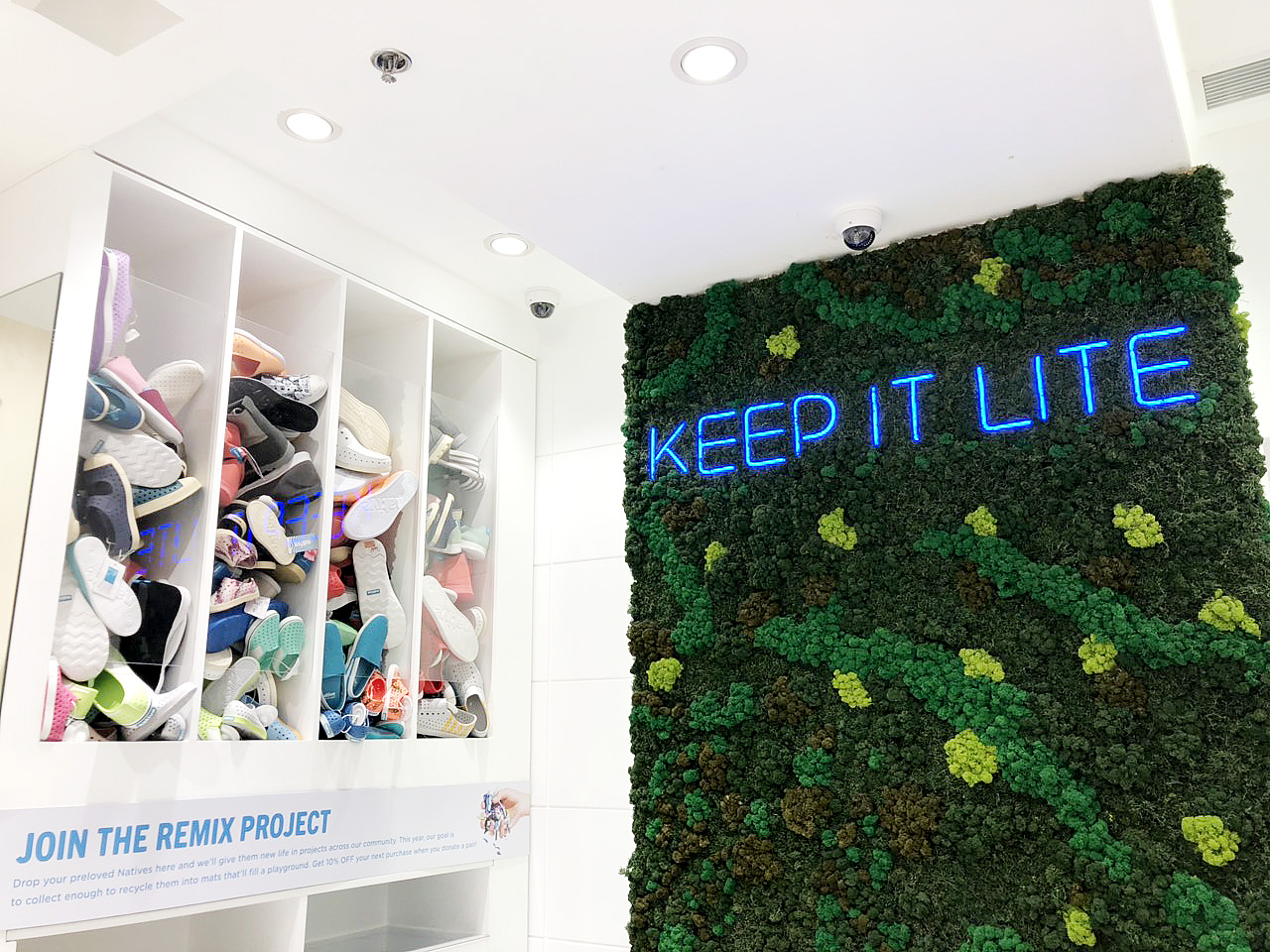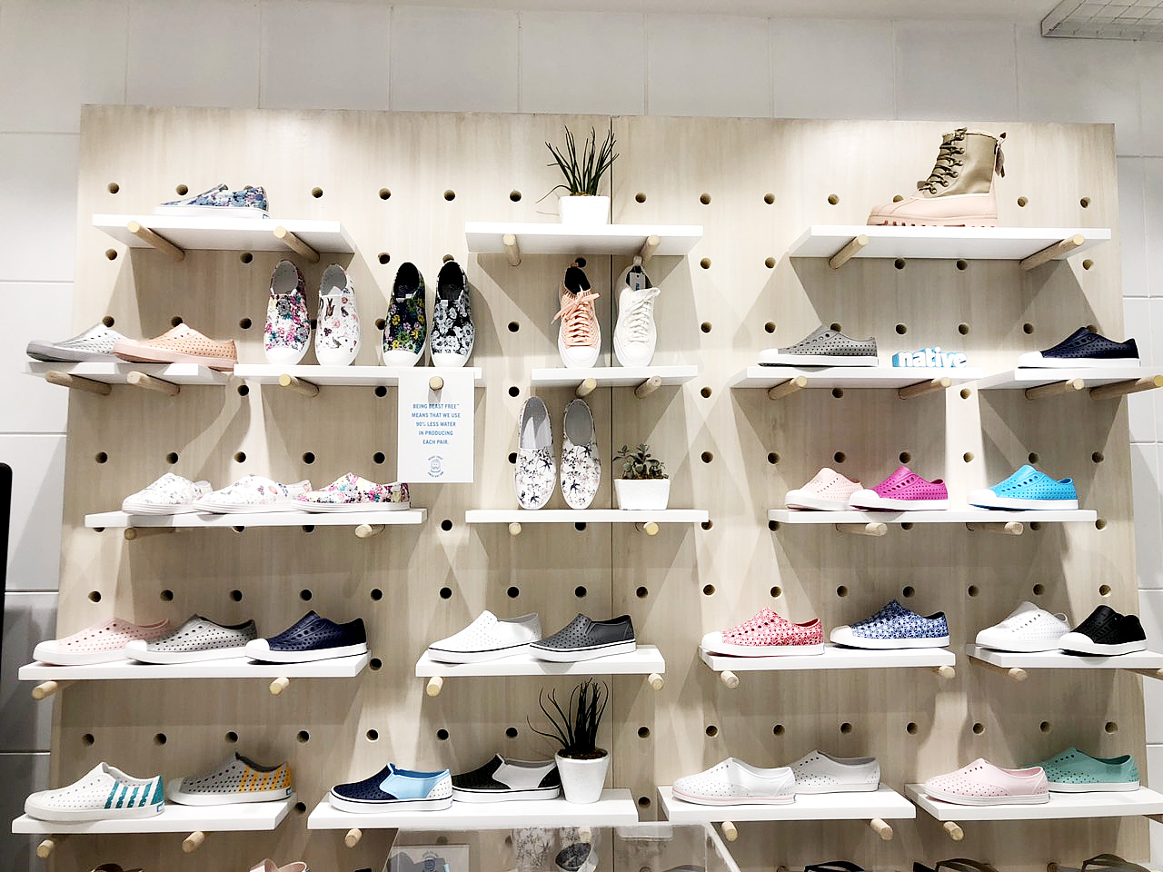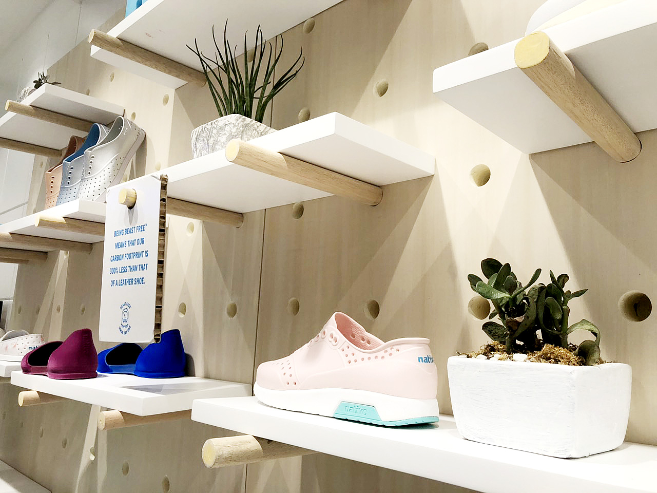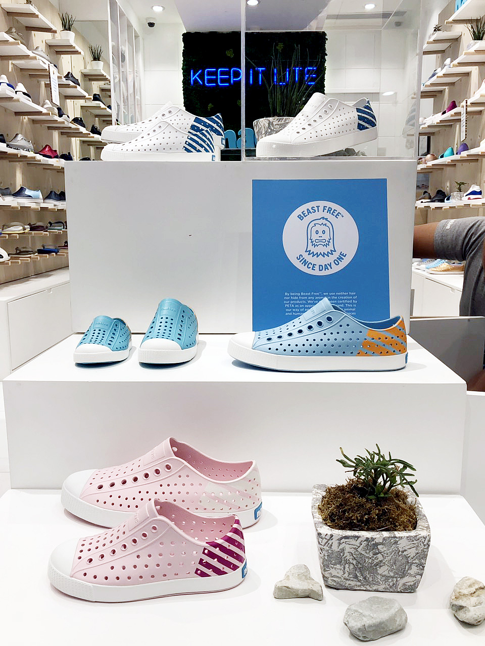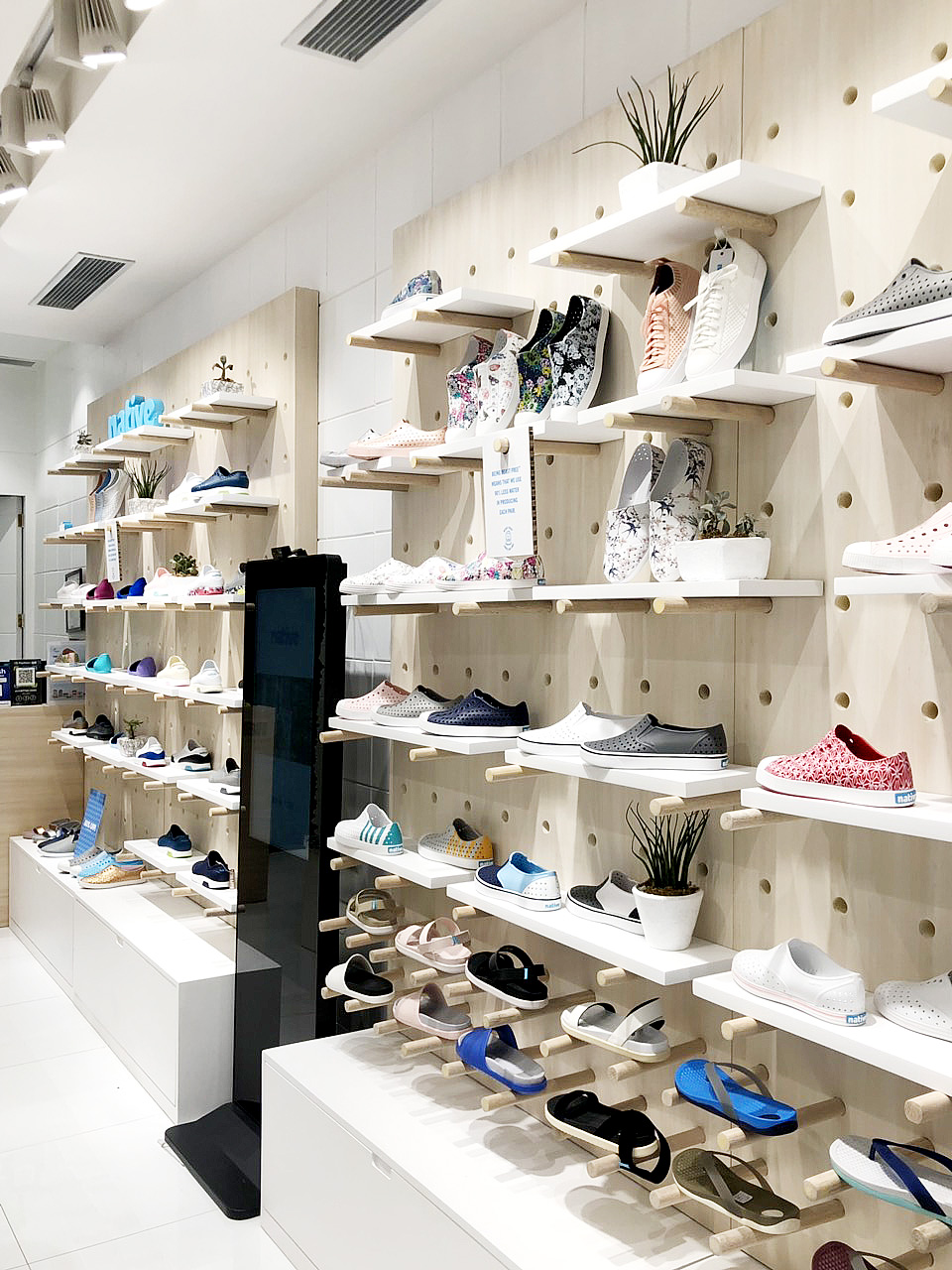 In keeping with being Beast Free and proud, Native Philippines unveiled its newly-renovated store in Glorietta last November 2018 — the first in the country to follow suit with the principal’s greener store concept for the Native bricks-and-mortar. Now the store is refreshed with a white and wood motif, featuring classic plywood pegboards and modular displays to showcase Native’s full line of men’s, women’s, and children’s shoes. There’s also an interactive screen playing the brand’s videos on-loop, for playing a quick memory game, or for browsing the products! But in the clean-and-crispness of it all, one of the first things to strike your sights would most probably be the lush green wall of live moss, bearing the brand philosophy in neon blue, standing just behind the store counter.