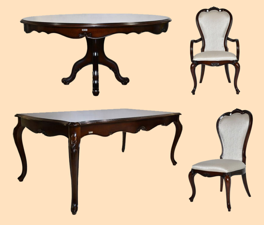 Transform your dining space and enjoy an exquisite dining experience with Nobizzi. These furniture pieces for the dining room have a dark wood finish with bold and intricate curves and lines that definitely add beauty to any dining area. Dine in style by choosing from these options: a six-seater rectangular dining table, an eight-seater rectangular dining table, and a six-seater round table. Finish off the classical look with cushioned seats or dining chairs with armrests.