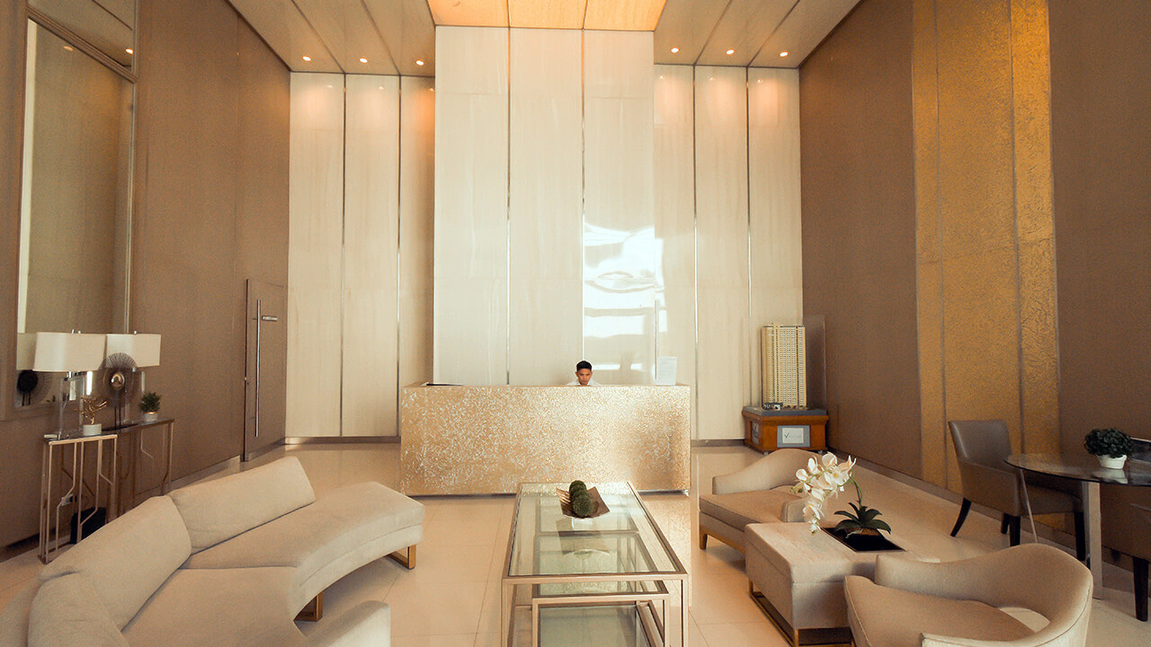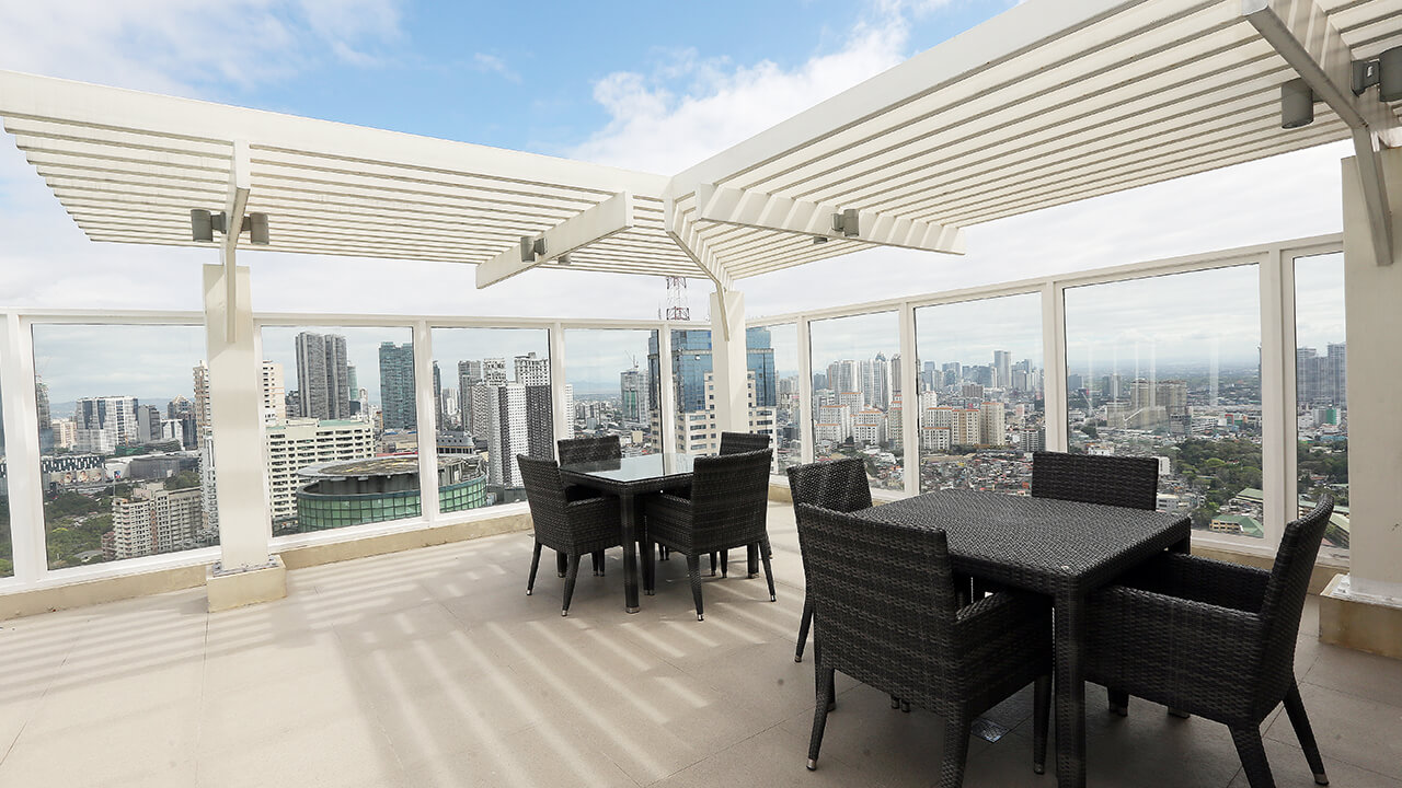 The wide driveway opens up to a high ceiling lobby reminiscent of golden era architecture. Sandstone claddings give the building an imposing image of strength and stability, and further enhances the shiny interior. The amenities can be found at the roof deck; the gym, function room and the swimming pool all have overwhelming view of the Metro Manila landscape, highlighted by the green scenery of the 18-hole golf course.