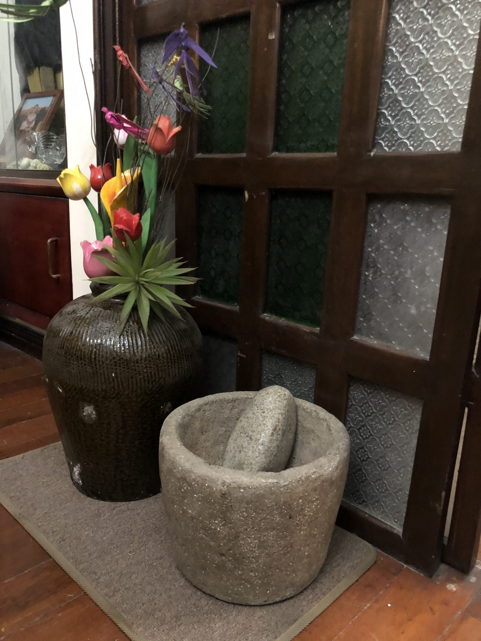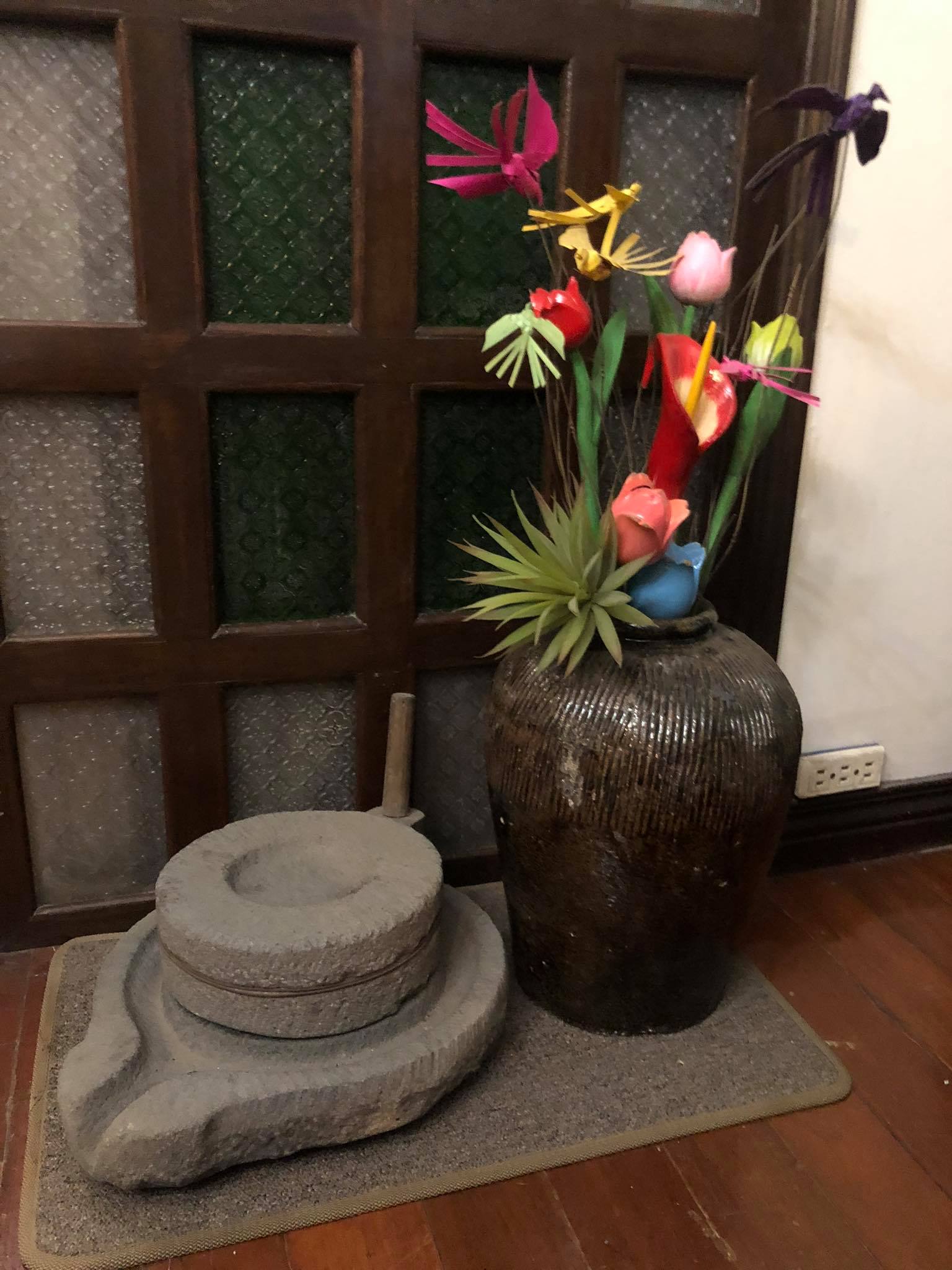 Old kamut jar used as a flower vase, with a vintage millstone (gilingang bato) as an accent piece