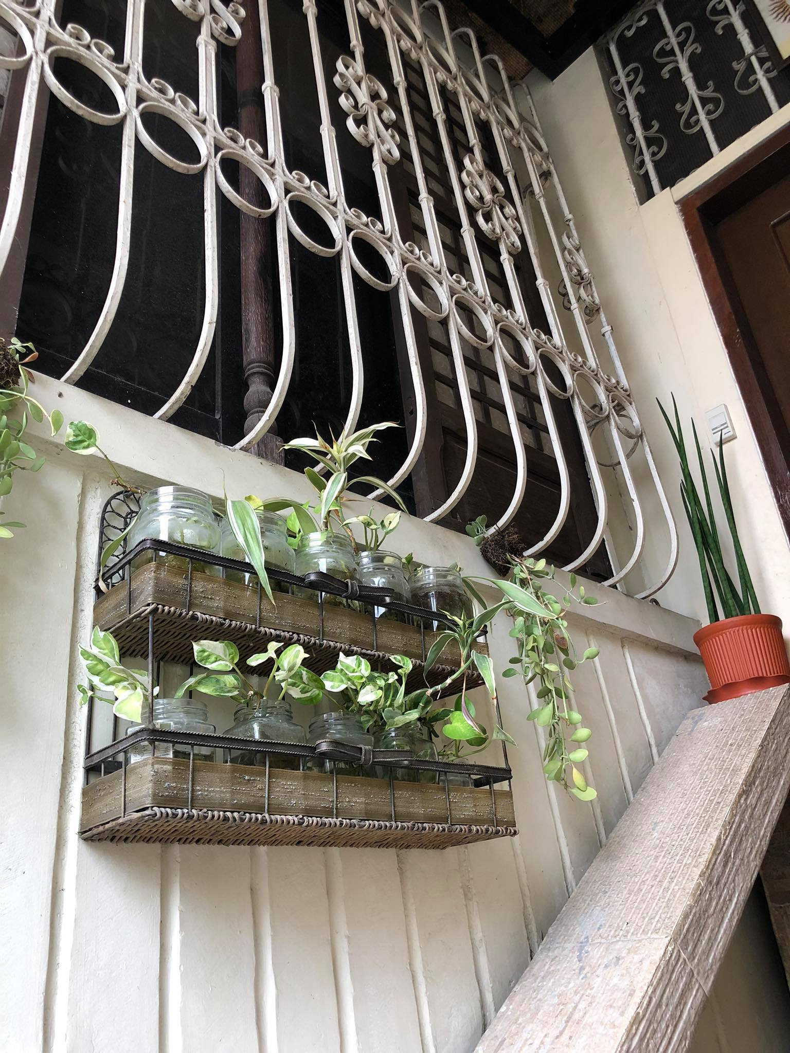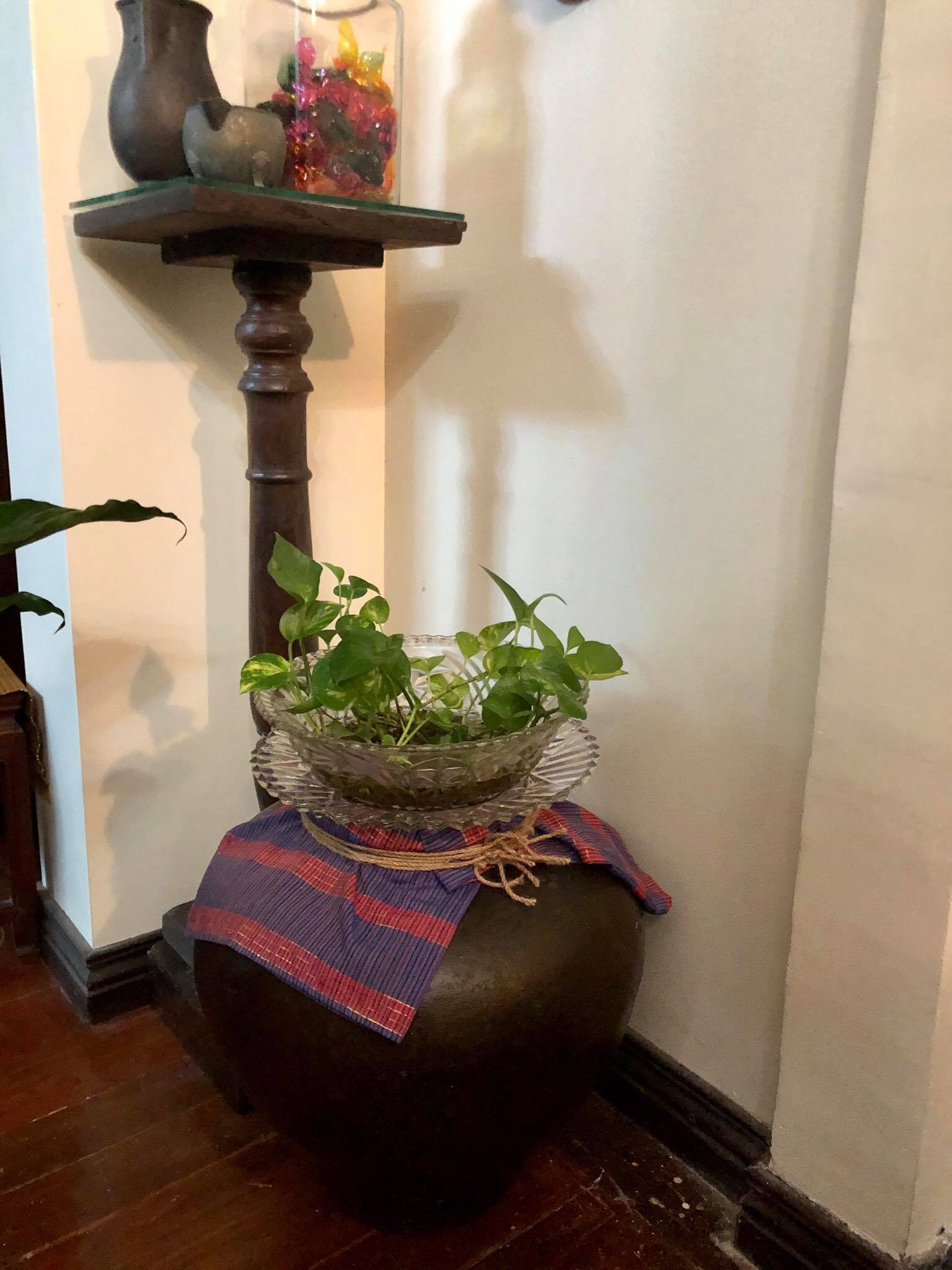 Old bowls and plates used as plant holder, with an old tubao as an accent piece