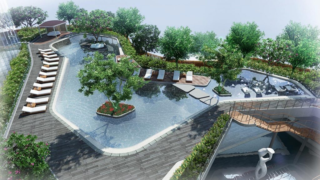 Just above, on the eight floor, are the expansive pool options — there’s a leisure and lap pool, a pool island, and a pool pavilion with a sun deck. For those who want to host some parties, a barbecue terrace that looks out to the landscaped garden areas, is dotted with lounges where one can pass time.