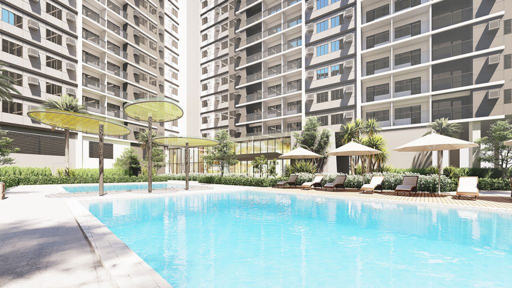 Residents will feel like they’re staying in a posh resort since the central landscape features leisure pools, and a lounge area surrounded by water and lush greenery.