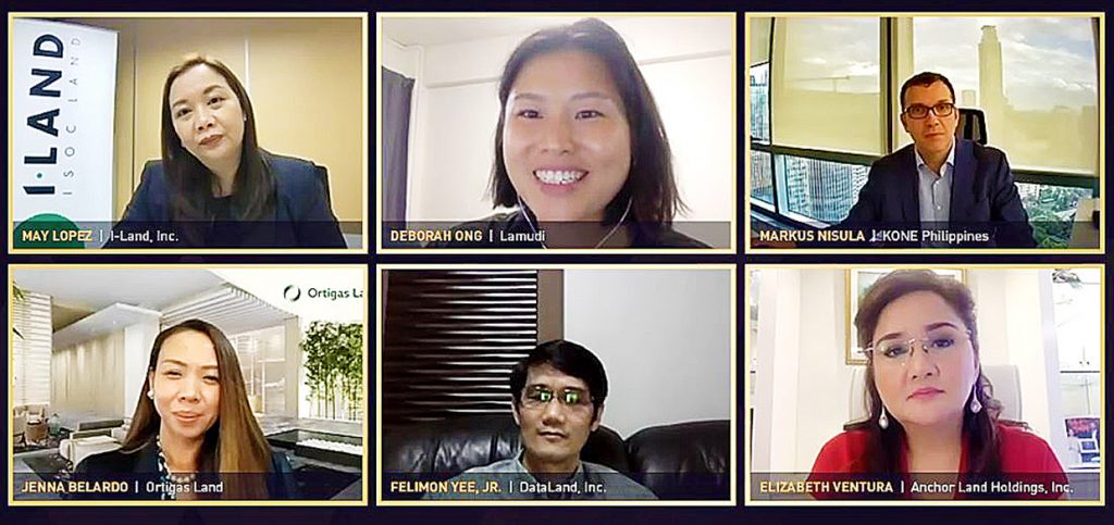 THE OUTLOOK RT. (First row, from left) I-Land VP and business unit head May Lopez, moderator Deborah Ong of Lamudi Philippines and KONE Philippines managing director Markus Nisula; (second row, from left) Ortigas Land AVP and business unit head for property sales Jenna Belardo, DataLand Inc. VP for business development and customer turnover Felimon Yee Jr. and Anchor Land Holdings Inc. president Elizabeth Ventura join Lamudi’s recent online roundtable series.