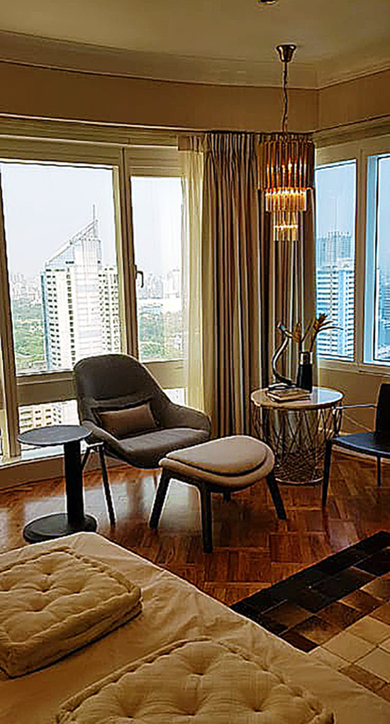 Inside a 230 sqm condo unit fronting Manila Bay, every sunset is made more glorious by wide windows and glass curtain walls, and the feel of contemporary luxury that takes cues from the Modern Era.